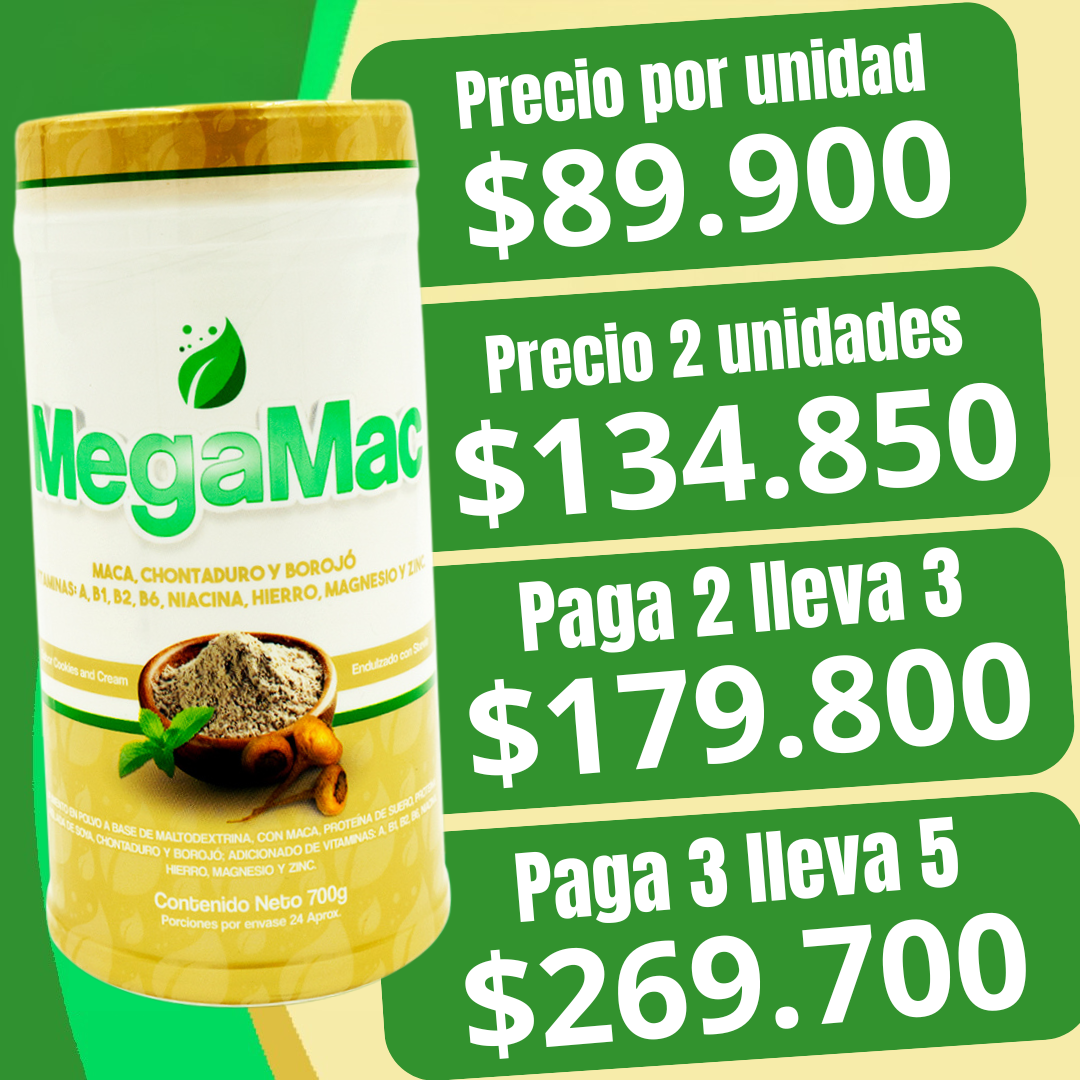 El MEGAMAC aumenta tu potencia resistencia, es un poderoso energizante y potencializador natural con maca, chontaduro, borojó, niacina, hierro, magnesio, zinc y vitaminas.